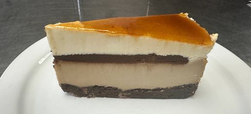 Brown Cow Cheesecake! Rich chocolate cheesecake moovin’ with milk chocolate chip cheesecake patches, finished with whipped cream topping and a chocolate drizzle.